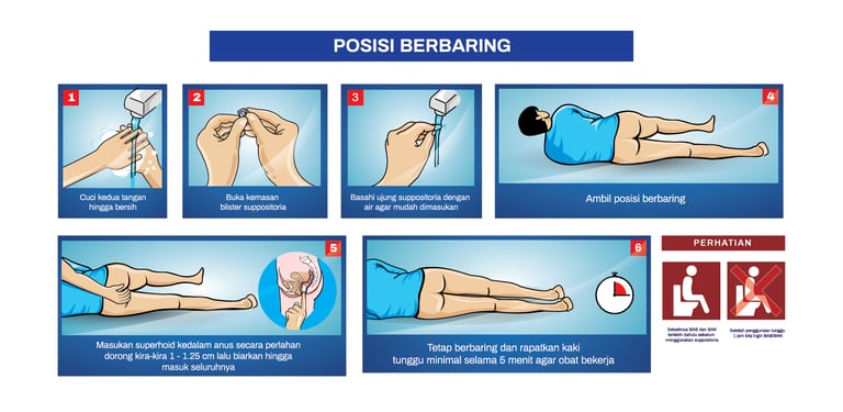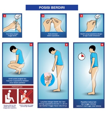 Suppositoria ini digunakan setelah buang air besar. Bila terjadi ruam, urtikaria, edema atau berbagai bentuk alergi, hentikan pengobatan.